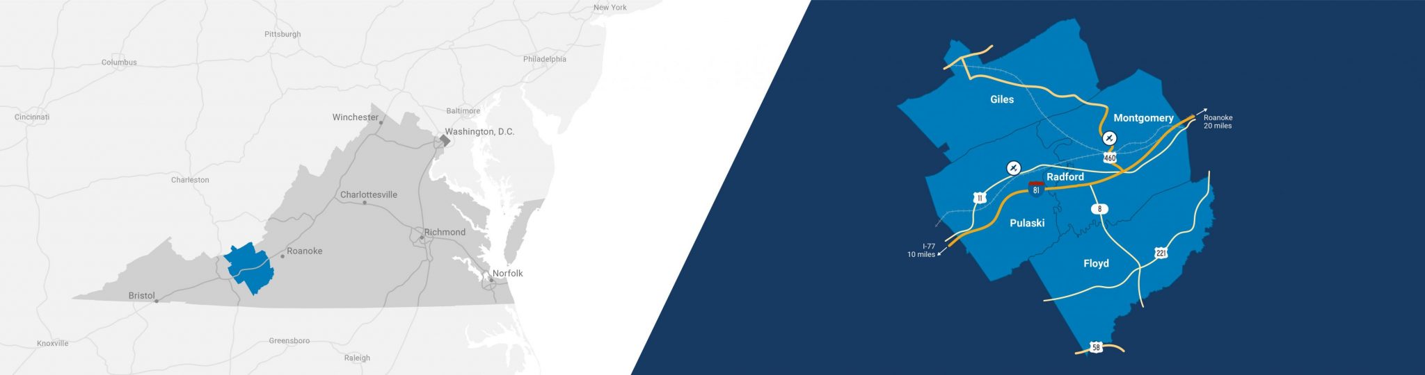 Virginia's New River Valley is located in southwestern Virginia in the midst of the Blue Ridge and Allegheny Mountains and bordered on the northwest by West Virginia. With Interstate 81 passing through the region and Interstate 77 just to the south, the area is strategically accessible to Northeast, Southeast, and Midwest markets.