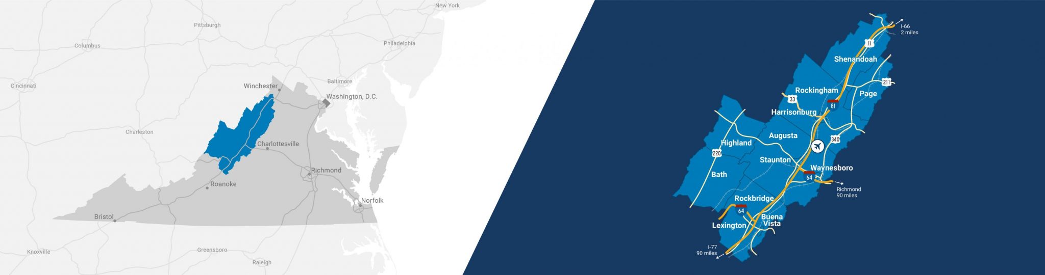 The Shenandoah Valley is in the heart of historic and scenic west-central Virginia in the Blue Ridge and Allegheny Mountains. Interstates 81 and 64 traverse the region, providing an excellent transportation infrastructure and connection to markets north or south and east or west.